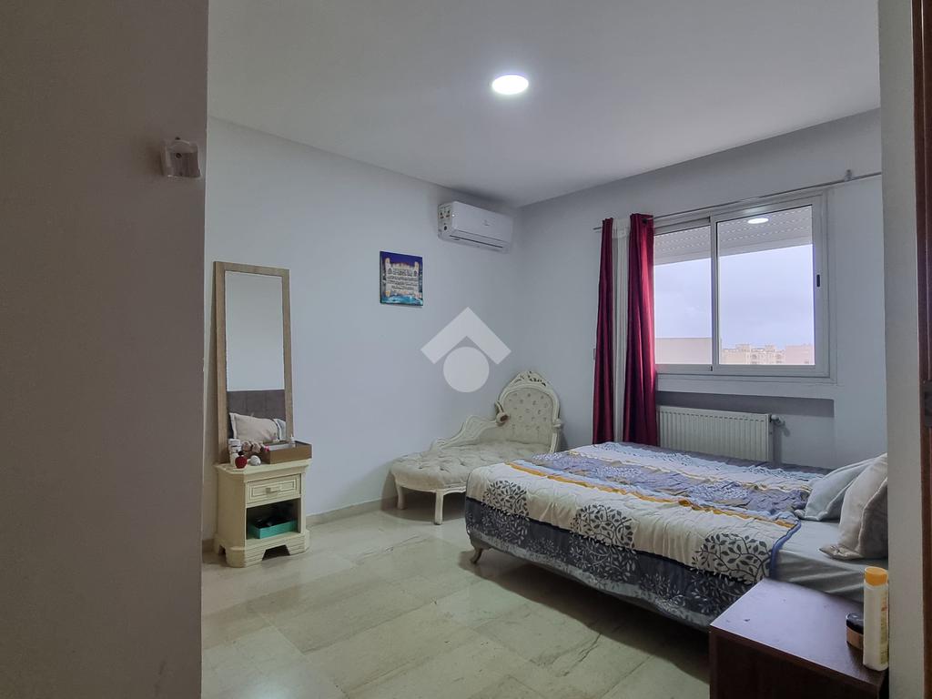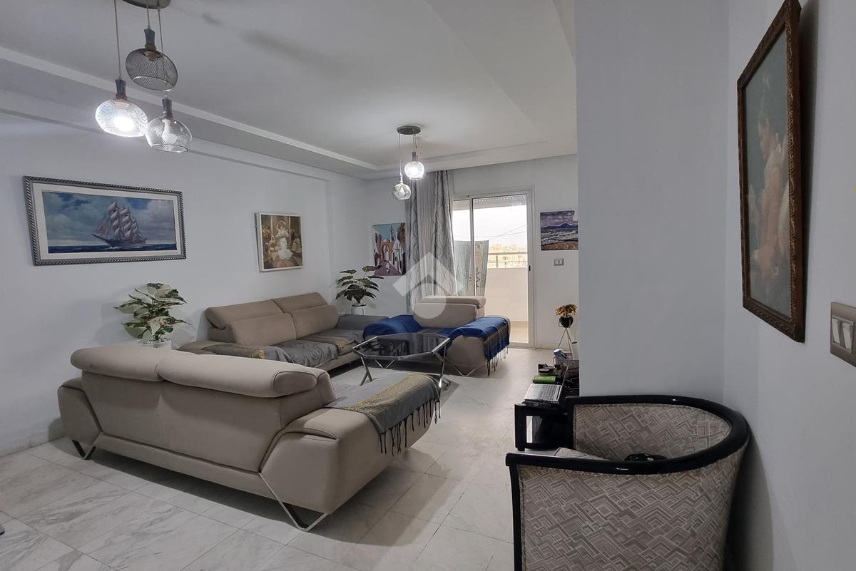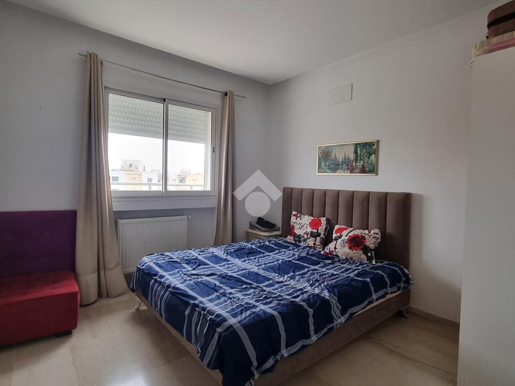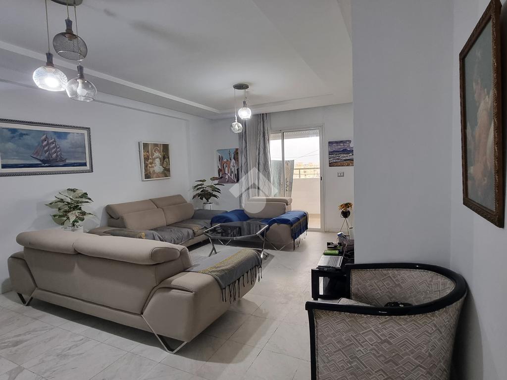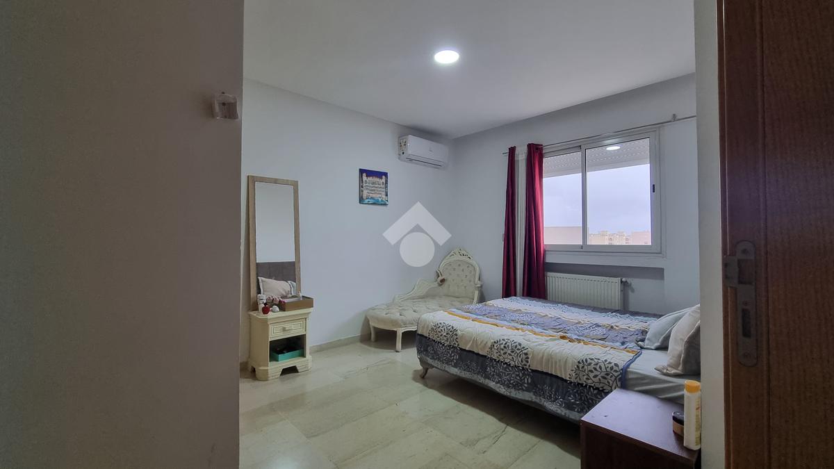 Cet appartement S+3 occupe le dernier étage d’une résidence sécurisée en R+7, dotée d’un double ascenseur. Il bénéficie d’un emplacement accessible et proche de toutes les commodités à Cité les Palmeraies – l’Aouina. Dès l’entrée, une pièce de vie lumineuse grâce à un accès direct au balcon donne sur une vue sans vis-à-vis. La cuisine aménagée avec des rangements est équipée d’une plaque de cuisson, d’une hotte aspirante et d’un four. Un séchoir est disponible pour plus de fonctionnalité. Une salle d’eau invités vient compléter la partie jour. Dans la continuité, un hall mène à la partie nuit, qui loge deux chambres à coucher, dont une avec dressing. Une salle de bain commune complète la partie nuit. L’appartement est équipé du chauffage central et de la climatisation en split système.